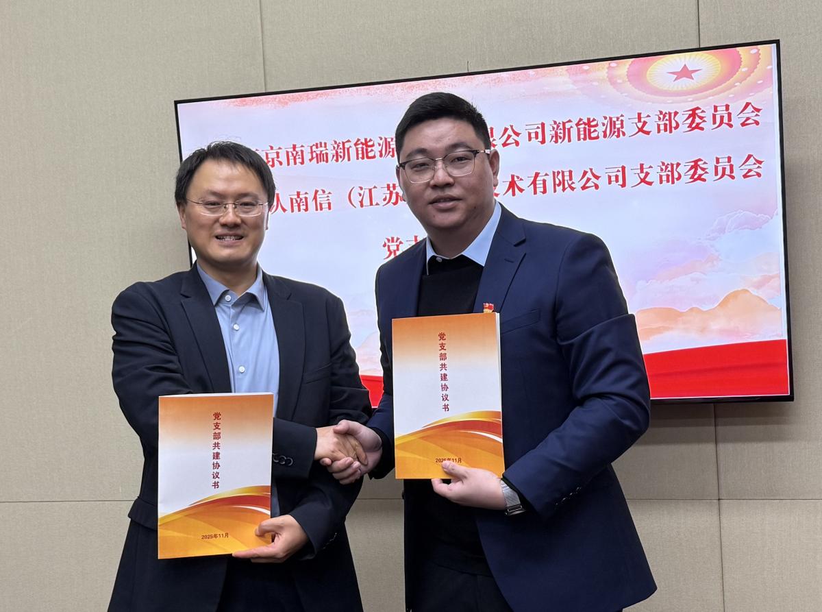 2025年11月7日,中认南信党支部书记赵凡与支部委员陈勇、彭勃一行,赴南瑞新能源党支部开展共建交流。在南瑞新能源党支部仲旻书记陪同下,交流组循着2023年习近平总书记视察南瑞集团的足迹,参观南瑞集团展示大厅,系统了解企业发展近况,认真聆听现场讲解。